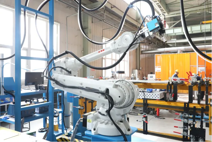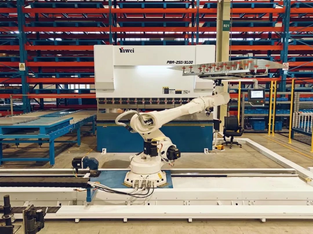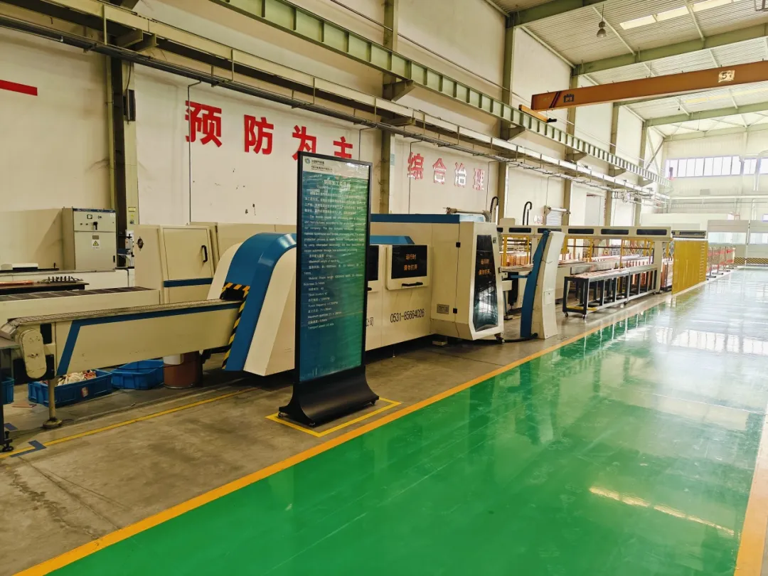 产线采用激光切割机柔性自动化设备、螺柱机器人自动焊接设备、机器人激光焊接设备,降低劳动强度,提高生产效率,实现充气柜气箱加工智能化、自动化。