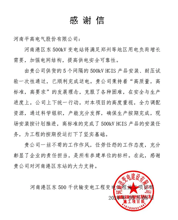 平高电气超特高压事业部收到了河南港区东电站施工项目部送来的感谢信和锦旗,客户对其高质量 91高清视频播放,高标准,高要求完成电站产品安装任务表示感谢。
